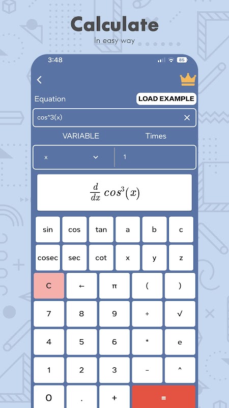 Bu türev çözücüyü kullanmak çok kolaydır. Sadece uygulamayı açın, hesap hesap makinesinin yumuşak klavyesini kullanarak istediğiniz matematik fonksiyon problemini yazın. Çöz düğmesine basın ve bu türev hesaplayıcıyı kullanarak herhangi bir sorun yaşamadan bir grafikle ayrıntılı bir cevap alın.