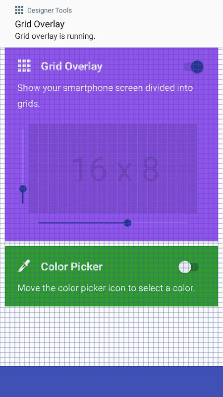Designer tools provide a grid overlay and color picker on your smartphone screen.