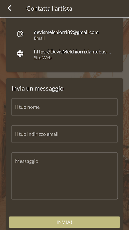 - Merkezi İletişim Bölümü: Devis Melchiorri'nin iletişim bilgilerini özel bir bölümde kolayca bulun. Doğrudan ve anında iletişim için sanatçıya doğrudan mesajlar gönderin.