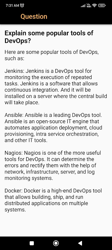 DevOps Röportaj Soruları: Özellikle DevOps ile ilgilenenler için uygulamamız, DevOps kavramlarına odaklanan 100'den fazla soru içeren özel bir bölüm içerir. DevOps görüşme senaryolarına ilişkin bilginizi derinleştirin ve kendinize olan güveninizi artırın.