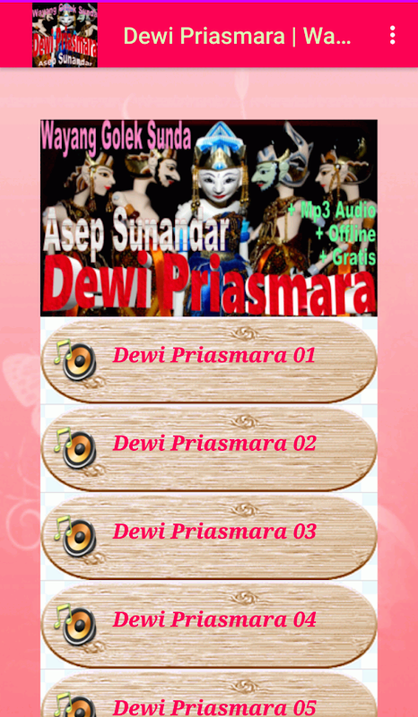 Dewi Priasmara adlı bir oyunda Sundanese Wayang Golek Mp3 seslerinin en iyi koleksiyonunun keyfini çıkarın. Dewi Priasmara'yı halen Sunarya ailesinin bir üyesi olan Ki Dalang Asep Sunandar seslendirdi. Dewi Priasmara, Sundan topluluk değerleriyle zengin bir wayang golek hikayesidir. Sundan esprileriyle (bobodoran) esprili bir şekilde sunulduğu için zevk almak çok zevkli.