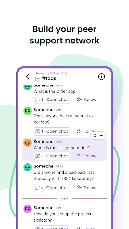 Differ ile yeni üniversite topluluğunuzu keşfetmeye başlayın. Sadece profilinizi oluşturun ve sosyal sohbet botu Bo sizi, sizinle ilgi alanlarını paylaşabilecek bazı öğrencilerle tanıştıracak. İlk konuşmayı başlatmanın garip olabileceğini biliyoruz, bu nedenle Bo buzları kırmanıza da yardımcı olacak.