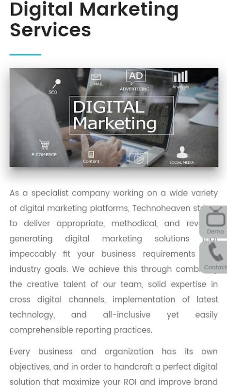 As an accomplished company working on a wide range of digital marketing platforms, Technoheaven seeks to deliver appropriate, efficient, and revenue creating digital marketing solutions that perfectly fit your business requirements and industry goals. We achieve this by combining the creative talent of our team, solid expertise in cross digital channels, implementation of latest technology, and all-inclusive yet easily comprehensible reporting practices.