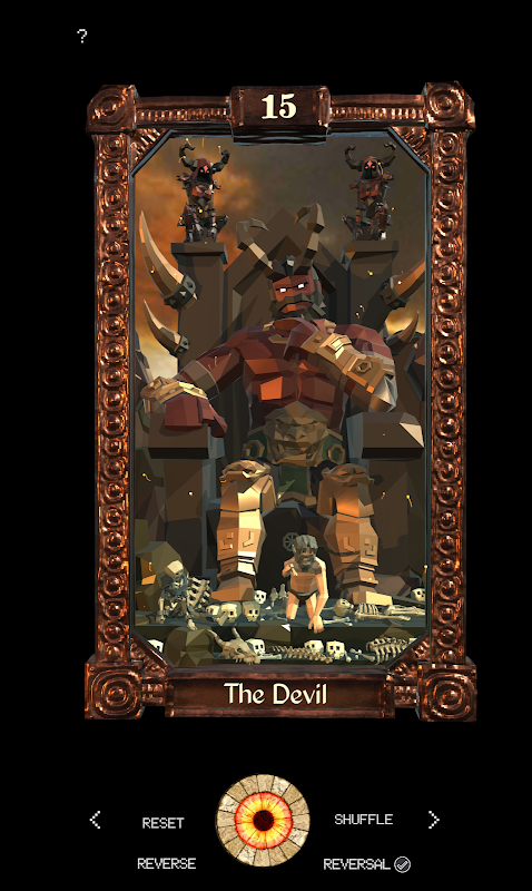 The deck was loosely based on the Rider Waite deck and it's symbolism with the focus being making the most visually appealing cards possible. Each card has some kind of animation whether it be a charging horse, magical effects, animated characters or falling snow. There is also no limit to how far you can rotate the cards so you can see behind the face and get some insight into how the scene was put together. If you lose the card or want to reset it back to its original state there is a reset button to put it back to the start.