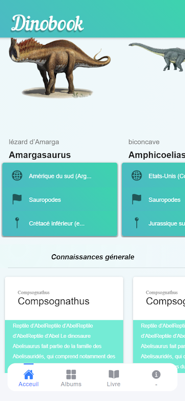 Dinobook est une encyclopédie dans votre poche. il répertorie un grand nombre de dinosaures ayant vécu. tout la liste de dinosaures trier et catégoriser pour une expérience, époustouflante.