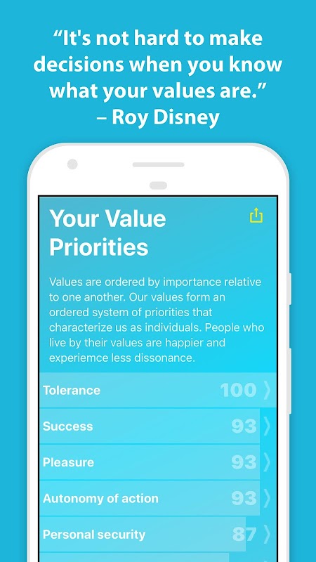 This app is based on the “Theory of Basic Human Values” by S. H. Schwartz. Schwartz’s research was validated in hundreds of studies and plenty of peer-review.