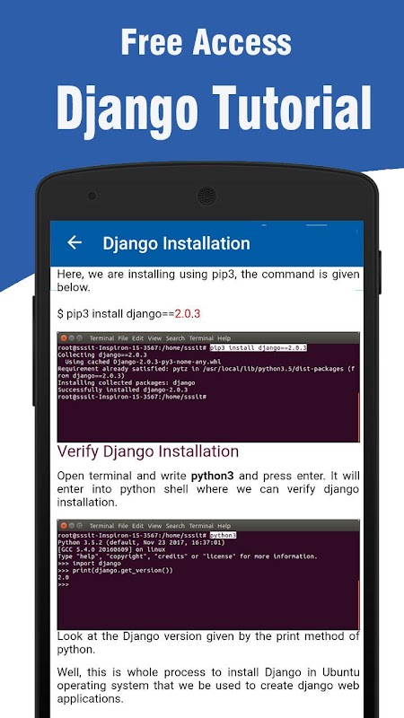 Django Tutorial provides basic and advanced concepts of Django. Our Django Tutorial is designed for beginners and professionals both.Django is a Web Application Framework that is used to rapid web application development.Our Django Tutorial includes all topics of Django such as introduction, features, installation, environment setup, admin interface, cookie, form validation, Model, Template Engine, Migration, MVT etc. All the topics are explained in detail so that reader can get enought knowdege of Django.