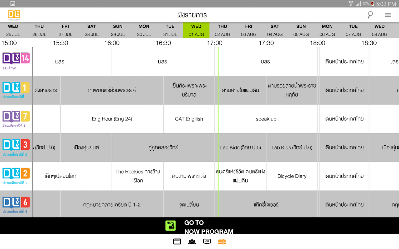 - ดูรายการสดช่องรายการแยกตามชั้นเรียน (DLTV1-15) ซึ่งสามารหยุดชั่วขณะระหว่างรับชม และกด Play เพื่อดูต่อได้