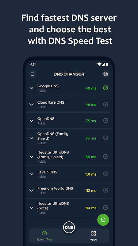 DNS değiştirici uygulamasıyla en hızlı DNS sunucusunu bulabilir ve tek dokunuşla ona bağlanabilirsiniz.