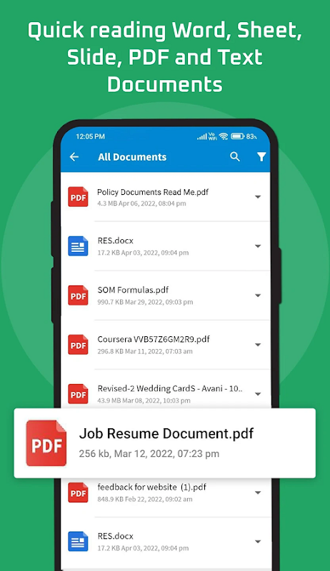 Highlights • Fast and easy viewing of your documents • Multiple document formats supported • Search particular document by name • Easily jump to recent open file • Easily delete & share multiple documents • All files well categories by file type like as Txt Documents, Pdf Documents, PPT Documents, Word Documents, Xls Documents, Zip Documents • All the functionality you can access without internet access it is complete offline application.