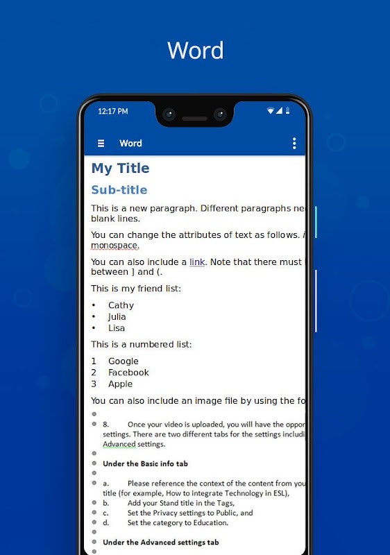 Bu docx okuyucu ücretsizdir ve telefonunuzun hafızasında fazla yer kaplamaz. Beğendiyseniz, lütfen 5 yıldızlı olumlu bir inceleme bırakın. Her katkı, uygulamayı sosyal medyada paylaşmaktan çekinmeyin