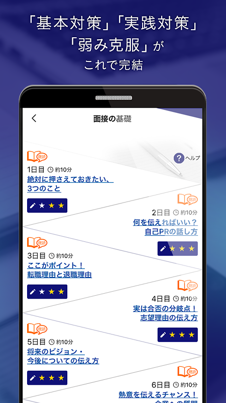 『面接の基礎を学ぶ』では「面接時のマナー」や「自己PR」、「志望動機の伝え方」など、面接の前に準備すべき基本的な内容が1日ごとに学べます。また『面接の基礎を学ぶ』内の各タイトルを読み終わった後には理解度をはかるための確認テストを3問用意しています。面接に向けての基礎固めができます。