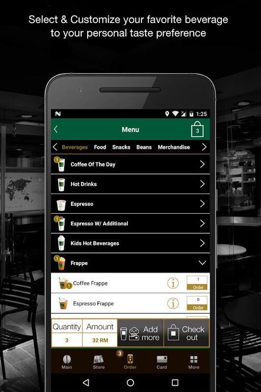 2. Select the beverage and food items to order: Just like in the store, beverages are customizable, including
