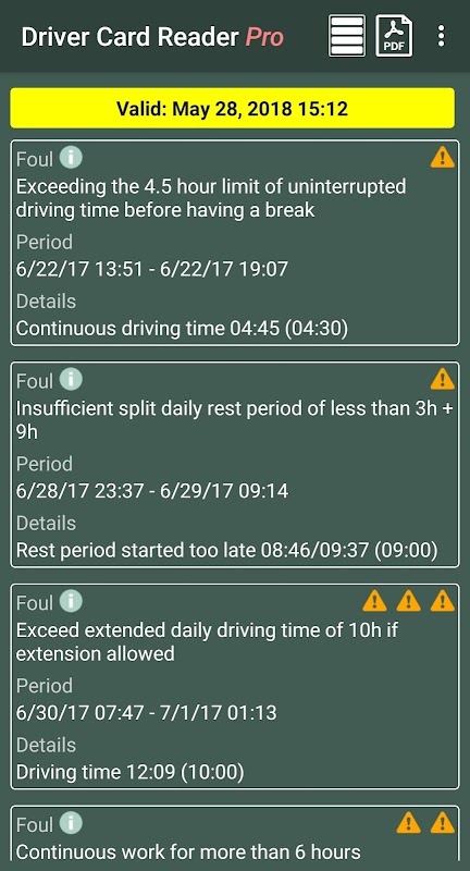 Uygulama sürücü kartındaki verileri analiz eder ve sürüş ve dinlenme sürelerindeki olası ihlalleri belirler. Sürücü faaliyetlerinin ayrıntılı bir listesini alabilirsiniz. Çalışma süresi muhasebenizi haftalık/aylık/vardiya dağılımında sizin için hazırlayacağız. Bu şekilde, işvereninizden aldığınız çalışma süresi muhasebesini bile kontrol edebilirsiniz. Çalışma/dinlenme sürenizi planlamanıza yardımcı olabiliriz.