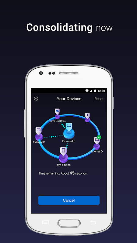 DriveSpan Uygulaması ile aynı WiFi ağı üzerinden bağlanan tüm cihazlarla konsolidasyonu rahatça kontrol edebilir ve tetikleyebilirsiniz. Birleştirme işlemi sırasında yinelenen ortam ve veriler algılanır ve merkezi depolamaya kopyalanmaz.