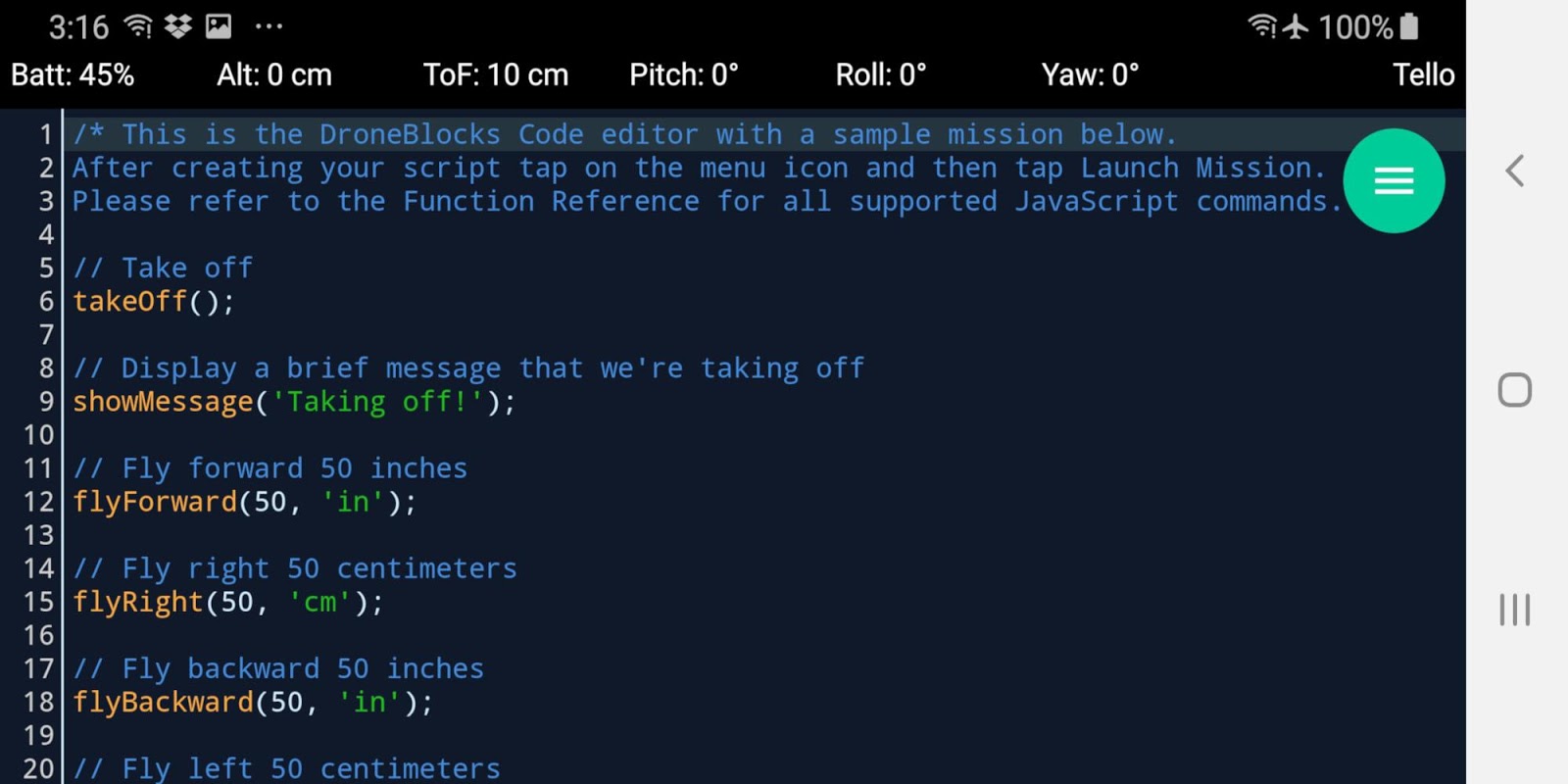 DroneBlocks Kodu, DroneBlocks ile blok kodlamanın ötesine geçen gelişmiş kullanıcılar içindir. "Kod" ile artık Tello ve Tello EDU'nuzu JavaScript ve daha gelişmiş programlama tekniklerini kullanarak programlayabilirsiniz.