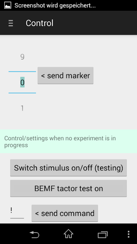 * Kontrol: Bu ekranda komutlar Arduino DRT cihaza göndermek olabilir. Örneğin start / stop. Hiçbir deney kurulumunu test etmek çalışırken ya da üzerinde uyarıcı açın. Deneysel koşullar işaretleri ile etiketlenebilir. Ör, denekler durumda şimdi olduğunu etiketlemek için işaretleyici '1' göndermek '1'.