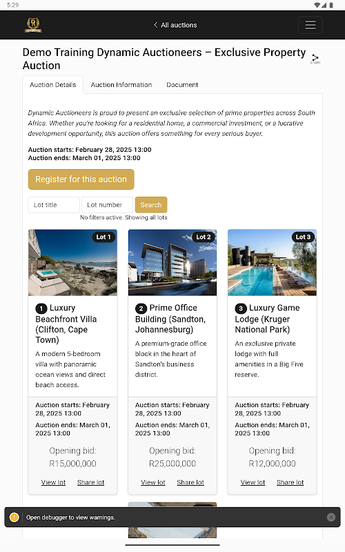 Dinamik Açık Artırmacılar açık artırmalarına katılmanız ve çevrimiçi teklif vermeniz gerekiyorsa, kaydolmak ve çevrimiçi tekliflere katılmak için uygulamayı indirmeniz yeterlidir. Bir hesap için kaydolun. Onaylandıktan sonra çevrimiçi teklif verebilirsiniz. Bir açık artırmayı gerçek zamanlı olarak izleyin ve açık artırmamıza her yerden erişin.