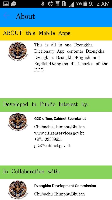 This app was developed by Dzongkha Development Commission in collaboration with G2C Office under the Prime Ministers Office of Bhutan, “In pursuit of Improving Public Service Delivery”.