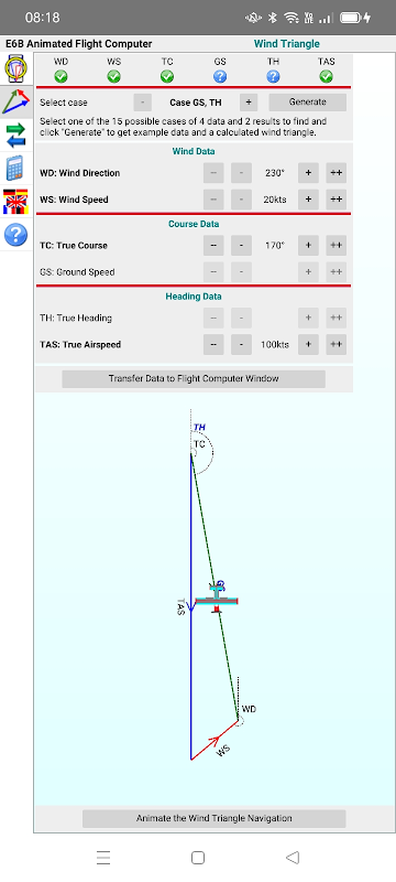 Bu uygulama, altı değerden dört tanesini (üç hız ve üç açı) girmenize ve kalan ikisini hesaplamanıza olanak tanıyarak bir rüzgar üçgenini çözer. Ardından, her adımın nasıl gerçekleştirileceğini gösteren animasyonlu bir uçuş bilgisayarı kullanarak bir çözüme nasıl ulaşacağınızı adım adım açıklar: animasyon diski döndürür, kaydırır ve işaretler ekler. Ayrıca, çözüme doğru her adımda verilen değerlerden hangisinin kullanılacağını da gösterir.