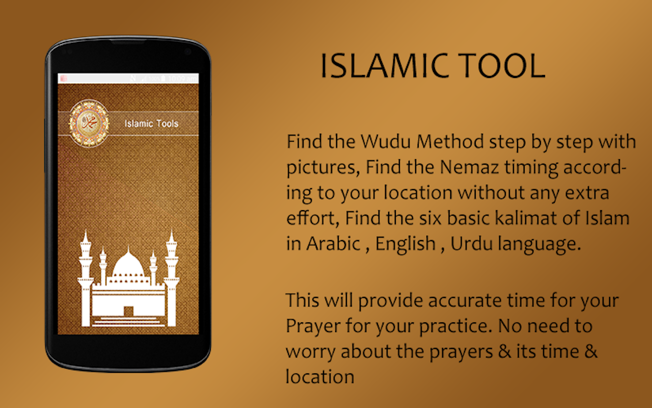 Find the Wudu Method step by step with pictures, Find the Nemaz timing according to your location without any extra effort, Find the six basic kalimat of Islam in Arabic , English.