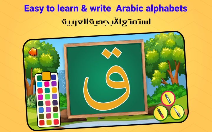 - Arapça alfabe veya Arapça harfleri öğretmek için hem İngilizce ses hem de Arapça ses vardır.