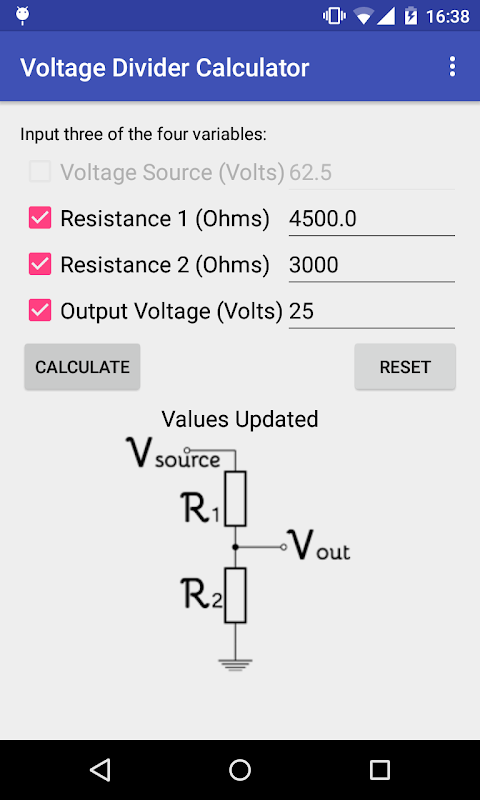 For the more convenient ad-free version: https://play.google.com/store/apps/details?id=barwick.voltagedividercalc