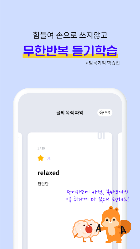 - 소리로 술술 암기 - 영어로 한 번, 한국어로 한 번 읽어줍니다. 손 안 대고 발음까지 한 번에 암기할 수 있습니다.