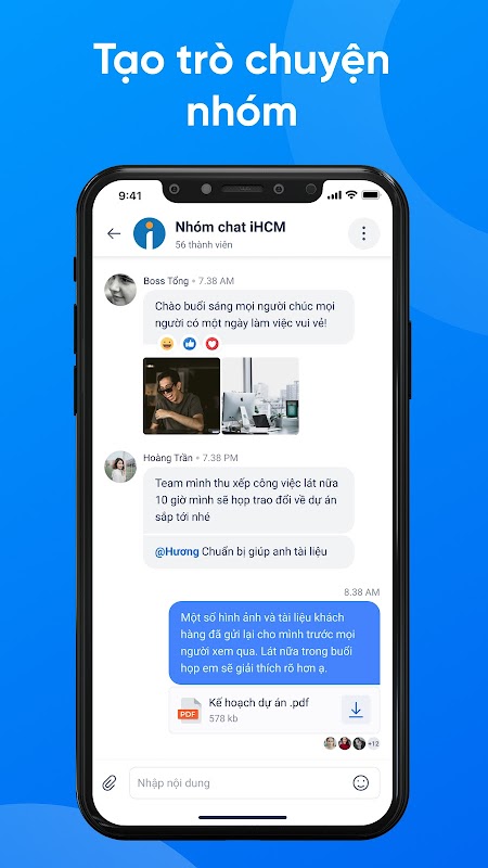 - File-sharing: attach files, images, videos, and links that are relevant to work