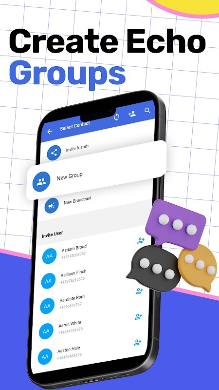 Karmaşık kayıt işlemlerine elveda deyin! Echo Chat ile kişilerinizle yalnızca telefon numaralarını kullanarak zahmetsizce sohbet edebilirsiniz. Yaygara yok, güçlük yok; yalnızca saf, doğrudan iletişim. Mükemmel çevrimiçi mesajlaşma uygulaması. Ücretsiz mesajlaşma artık daha kolay