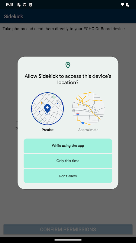 Android akıllı telefon cihazınıza Sidekick yüklendiğinde, fotoğraf çekebilir ve bunları doğrudan Bluetooth üzerinden ECHO'ya bağlanmaya ve görev güncellemeleriyle birlikte yüklenmeye hazır ECHO OnBoard cihazınıza gönderebilirsiniz.