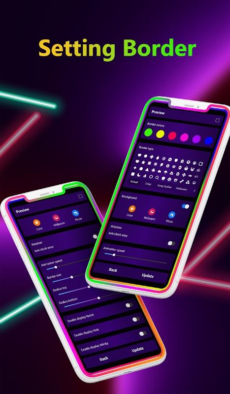Edge Light -Borderlight uygulaması tüm android telefonlarda kullanılmaktadır. Bu sınır ışığı, cep telefonunuzda kavisli bir kenar gösterir. Ayarlar panelinde tüm ayarlar mevcuttur. favori renginizi değiştirin, genişliği ayarlayın, EDGE kenarlığını seçin Aydınlatma, farklı çentik ayarları sizin seçiminiz ayrıca Lighting Magical EDGE seçeneğini kullanın.
