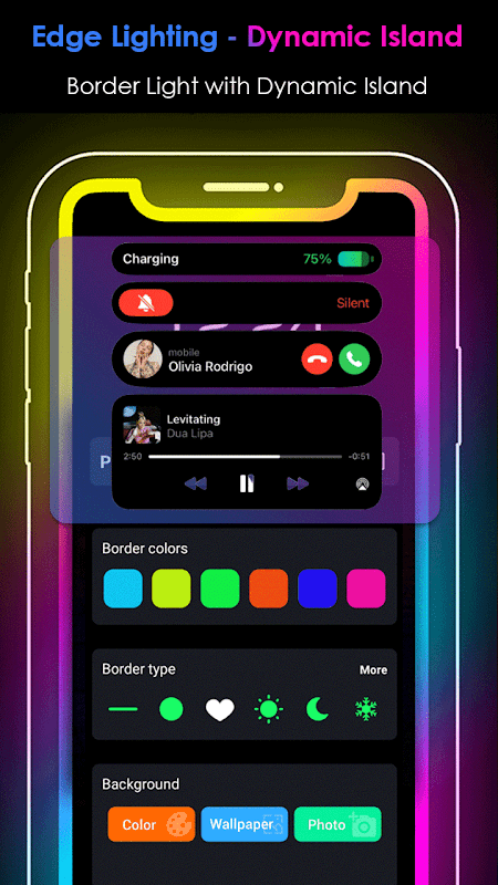 - Telefonunuzun pilini boşaltmadan akıllı telefonunuzda led renkli ışıkları ve kenarlık canlı duvar kağıdını ayarlayabilir ve özel sınır ışığı uygulamasını değiştirebilirsiniz.