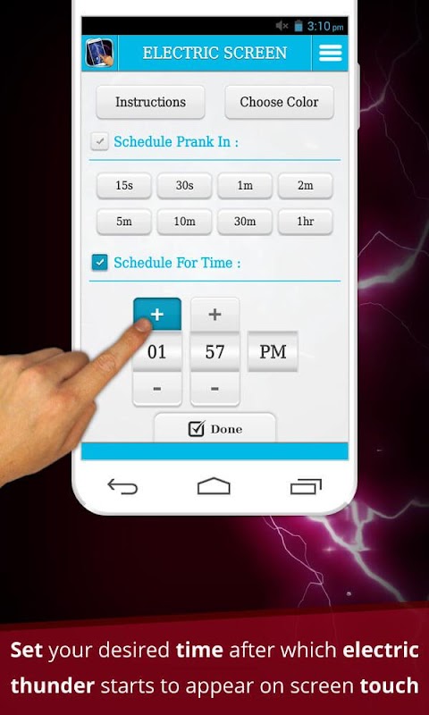 • Set your desired time after which electric thunder starts to appear on screen touch.