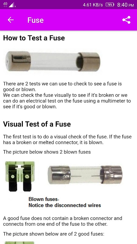 -In this application you will learn how to test diode,fuse,capacitor,resistor ,transistor and also relay.