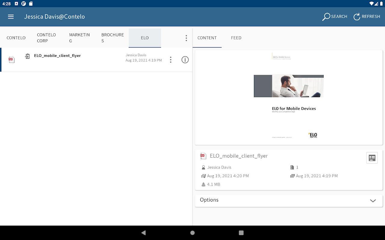 ELO uygulamasıyla, mobil cihazınızı kullanarak şirketinizin ELO arşivine erişebilirsiniz. Uygulama, belgelerinize ve ilgili tüm ayrıntılara hızlı erişim sağlar. Ofis dışındayken belgeleri yakalayıp dosyalayabilir ve ELO'da bilgi arayabilirsiniz.