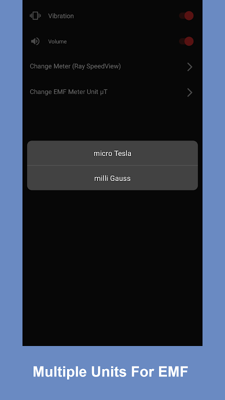 This Ultimate EMF detector & EMF Scanner app for android has two broad types of meters to indicate the EMF readings. One is digital EMF meter and other one is analog EMF meter. This free electromagnetic field sensor app also produces beep sound when a potential EMF is detected. It also contains many skins for the two types of EMF Detectors. This app also allows to choose between two units for the readings to be shown on screen. micro-Tesla and milli-Gauss.