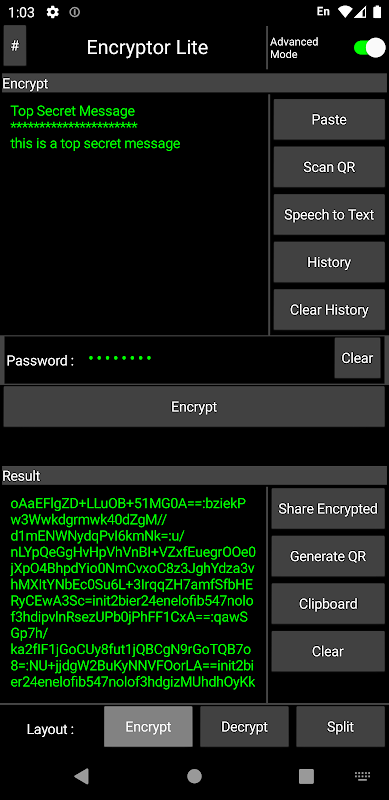 Kullanıcılar, paylaşmak istedikleri bazı metinleri şifrelemek için bu uygulamayı kullanabilir, metni şifrelemek için şifre girmeleri gerekir. Ve alıcı uçta diğer kullanıcı şuna benzer bir şifreli metin alacak: [Ravh4bnn2ugf43434434p3bvu3fnj3upoen3i4] bu mantıklı değil, ancak şifreyi kullanarak (şifreli mesajı oluşturmak için ilk kullanıcı tarafından kullanılan şifre) şifresini çözebiliriz ilk kullanıcının şifrelediği mesajı almak için mesaj. Şifrelenmiş mesajları QR-Kodları olarak paylaşmanın başka bir yolu vardır, bu yöntemde kullanıcı, uygulamanın diğer uygulamalar aracılığıyla doğrudan uygulamanın kendisinden paylaşılabilen özelliklerini kullanarak bir QR-Kodu oluşturabilir. Ve bu Qr-Kodu da yazdırılabilir. Bu QR Kodundaki mesaj, yalnızca ilk kullanıcıların Kodu oluşturmak için kullandığı şifre kullanılarak Kırılabilir.