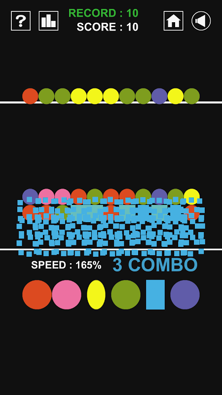 - Circles of 6 colors come down from the top of stage. Destroy circles before stage is full.