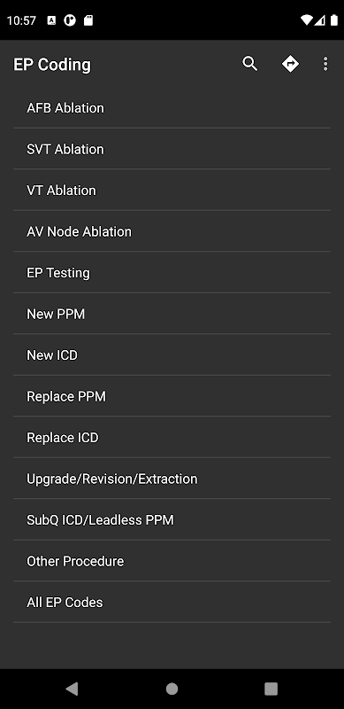 En son kodlama yönergelerine göre uygun CPT® kodlarını seçerek prosedürlerini belgeleyin ve faturalandırın. Uygulama profesyonel kodlayıcılar için değildir ve yalnızca EP doktorlarıyla ilgili kodları içerir. Prosedür kodlarını doğrudan bilgisayarlı Elektronik Sağlık Kayıt sistemlerine girmesi gereken veya yaptıklarını kodlayıcılarına iletmesi gereken hekimler için kullanışlıdır. Kod girme kuralları karmaşıktır ve kodların kendileri anımsatıcı değildir, dolayısıyla bu uygulama. Bu uygulama şu anda 2019-2020 kodlarını kullanıyor ve kodlama değişiklikleri olarak güncellenecektir. Ek olarak, aranabilir tam bir ICD-10 teşhis kodları seti dahildir. Bu uygulamanın kullanımından kaynaklanabilecek herhangi bir kodlama hatasından sorumlu değiliz.