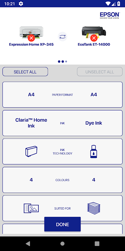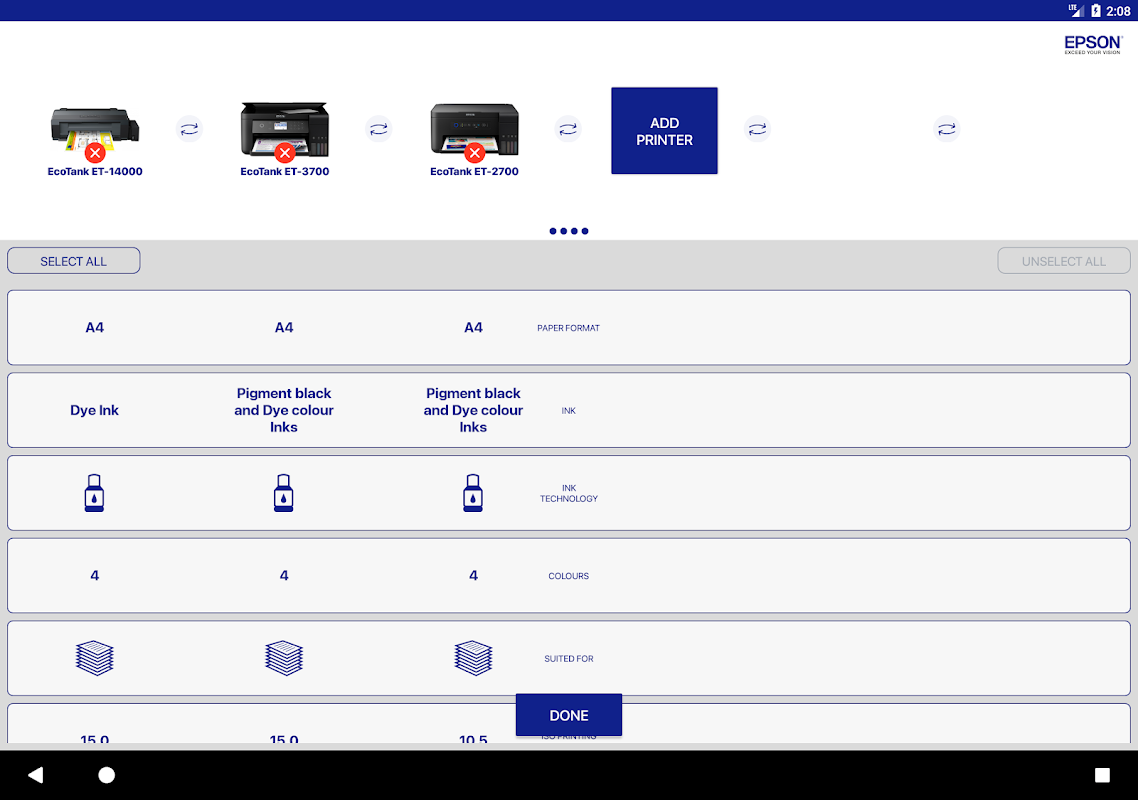 Mobil cihazınızda hızlı ve kolay Epson Yazıcı Özellikleri karşılaştırın
