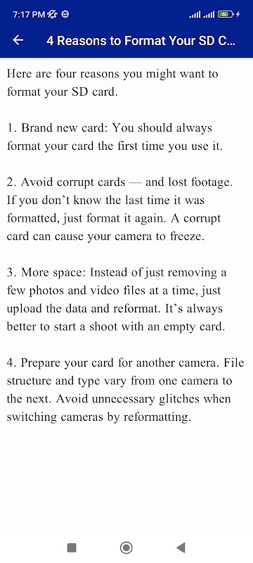 Bu uygulama Dosyaları kalıcı olarak silmek ve SD kartta yer açmak için kullanımı kolay bir kılavuz. SD kartı biçimlendirmek, içinde depolanan tüm fotoğrafları, videoları ve dosyaları kaldıracaktır. Çok kullanışlı bir rehber uygulaması, bazı püf noktaları var.