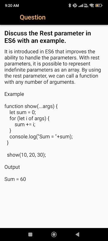 ES6 Mülakat Soruları: Özellikle ES6 ile ilgilenenler için, uygulamamız ES6 kavramlarına odaklanan 100'den fazla soru içeren özel bir bölüm içerir. ES6 görüşme senaryolarında bilginizi derinleştirin ve kendinize olan güveninizi artırın.