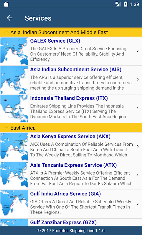 - Services including rotation, transit time, terminals, out ports and inland table