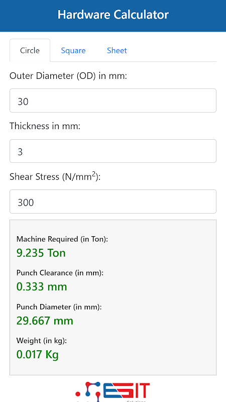 Estimator is a tool for hardware products manufacturer. Manufacturer can estimate the punching details for Mild Steel flat circle and square. They can also get an estimation on the weight of Mild Steel Sheet.