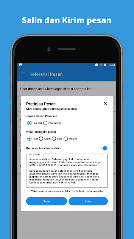 Öğretim Görevlileriyle Sohbet Etme Etiği, öğrencilerin öğretim görevlileriyle kısa mesaj yoluyla etkili ve kibar bir şekilde iletişim kurmalarına yardımcı olmak için özel olarak tasarlanmış bir uygulamadır. Bu uygulama, rehberlik istemek, ders programları hakkında soru sormak veya final ödevi danışmaları gibi çeşitli amaçlarla öğretim görevlileriyle iletişime geçerken öğrencilerin uygun, resmi ve uygun cümleler oluşturmalarına yardımcı olabilecek kılavuzlar ve çeşitli referanslar sağlar.