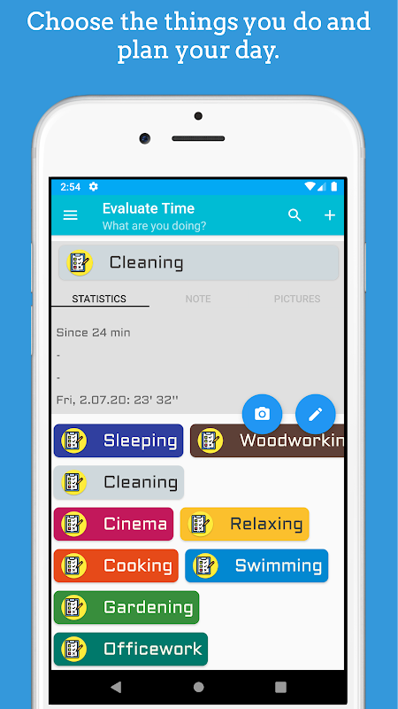 Gün boyunca yaptığın etkinlikleri ekle. Aynı zamanda notlar ekleyebilir. Evaluate Time kaydedilmiş etkinlikleri istatistikler ve takvim bölümünde saklar. Bu uygulama alışkanlıklarınızı daha iyi anlamanıza yardım edebilir. Yaptığın etkinliklerin kaydını tut ve daha yaratıcı olmak için desenler oluştur!
