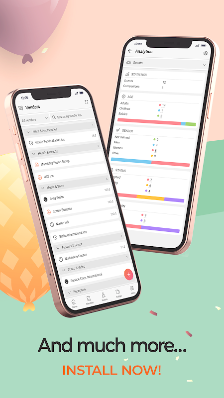 Konukların ve refakatçilerin bir listesini yapın. Misafirleri gruplara ve tablolara ayırın, menüleri planlayın. Parti planlayıcımız her şeyi analiz etmenize yardımcı olacaktır: cinsiyet, yaş, LCV'ler, davetler, katılım…