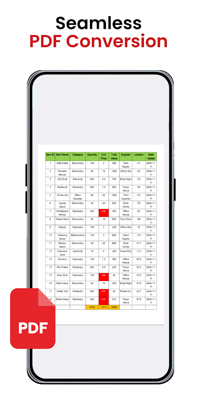 Excel dosyalarını (XLS/XLSX) tek dokunuşla kolayca yüksek kaliteli PDF'lere dönüştürün! Bu hızlı ve doğru Excel'den PDF'ye dönüştürücü, kusursuz bir deneyim sağlamak için metin biçimlendirmesini, hücre renklerini ve arka plan ayrıntılarını korur.