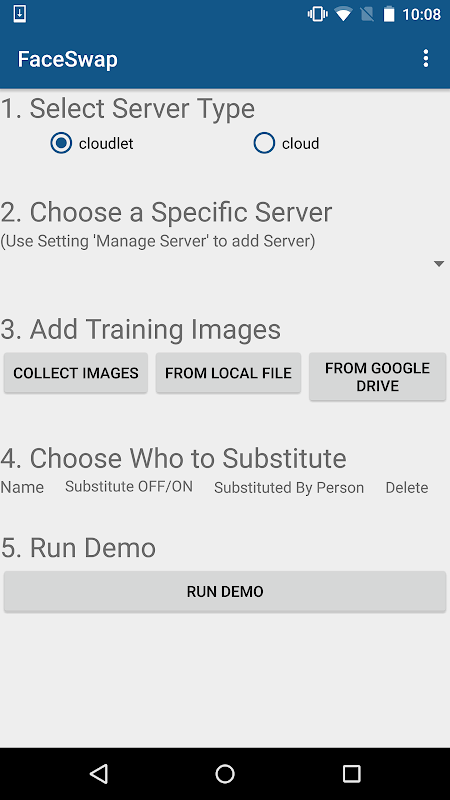 Bu cloudlet ve bulut arasındaki ağ gecikmesi farklılıkları göstermek için kullanılabilecek bir yüz takas demo uygulamasıdır.